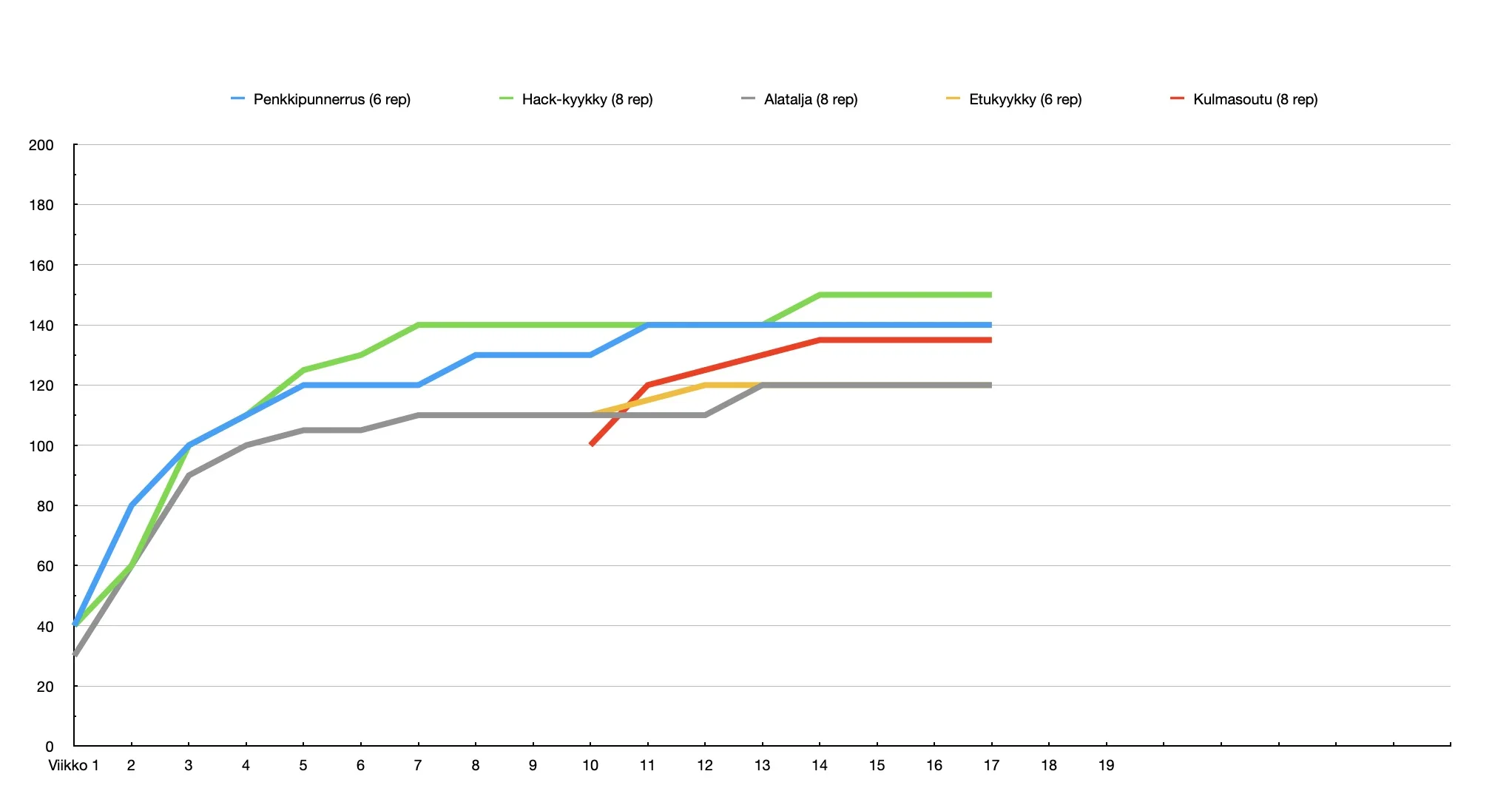 • Penkkipunnerrus 12x100kg, 8x120kg, 4x140kg, 1x150kg, 5x160kg, 5x150kg, 6x140kg