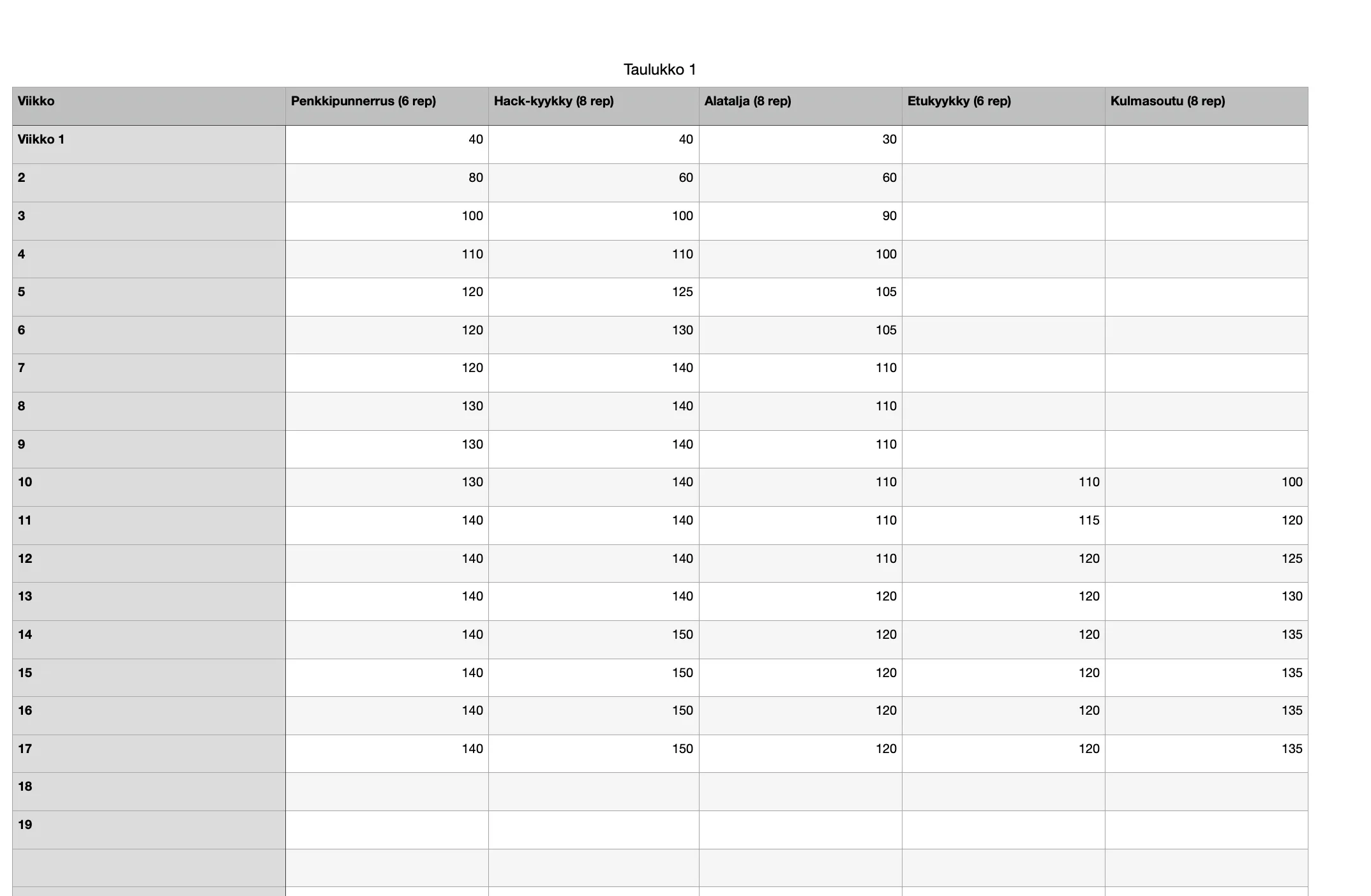 • Alatalja 10×82,5kg, 8x105kg, 2x 8×112,5kg