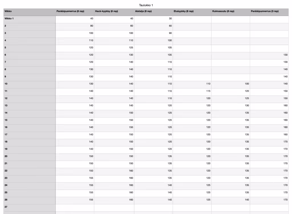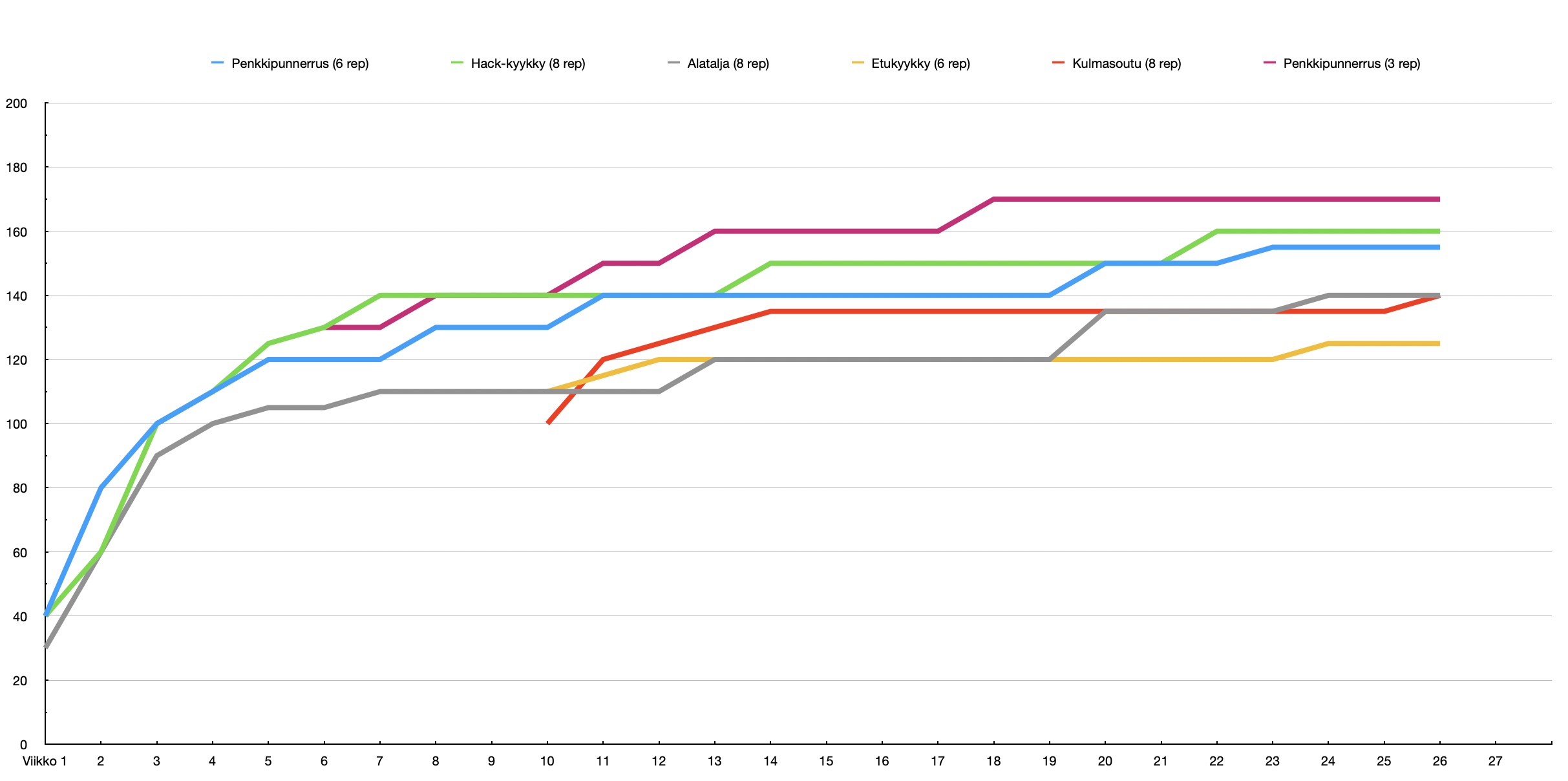• Reidenojennus 15×37,5kg, 10×44,5kg, 8×48,5kg, 7×48,5kg, 6×44,5kg -> 6x20kg (hitaita, puristavia toistoja)